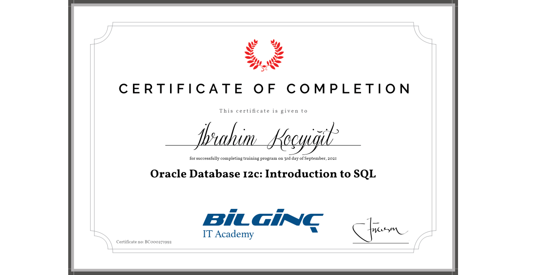 Oracle Database 12c: Introduction to SQL Training Completion Certificate