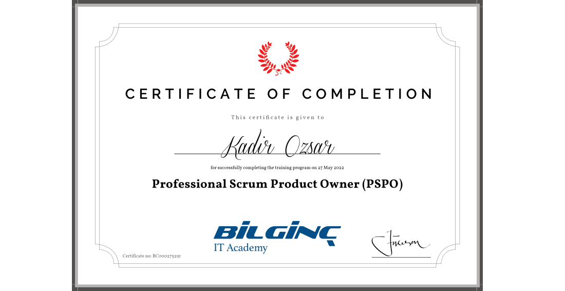 Professional Scrum Product Owner (PSPO) Training Completion Certificate