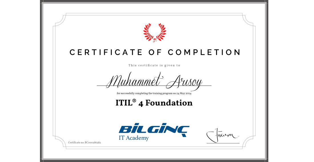ITIL® 4 Foundation - IT Service Management Certification Training Completion Certificate