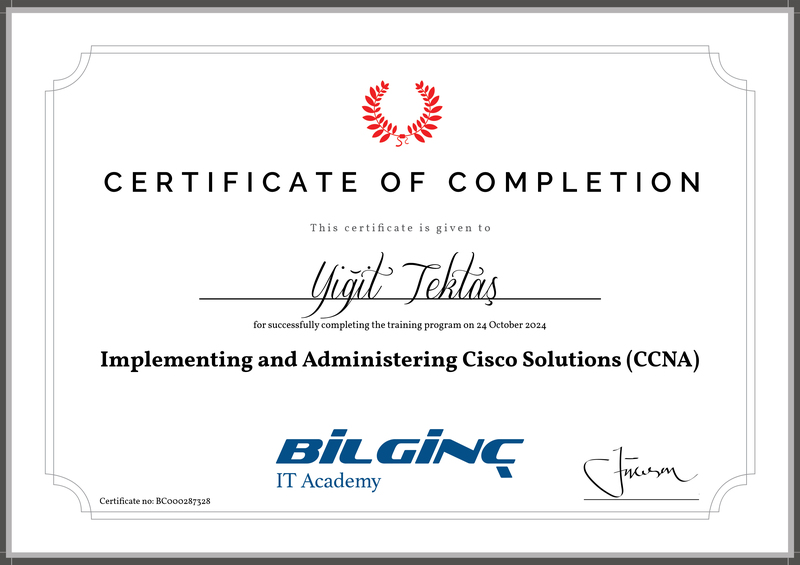 Implementing and Administering Cisco Solutions (CCNA) Training Completion Certificate