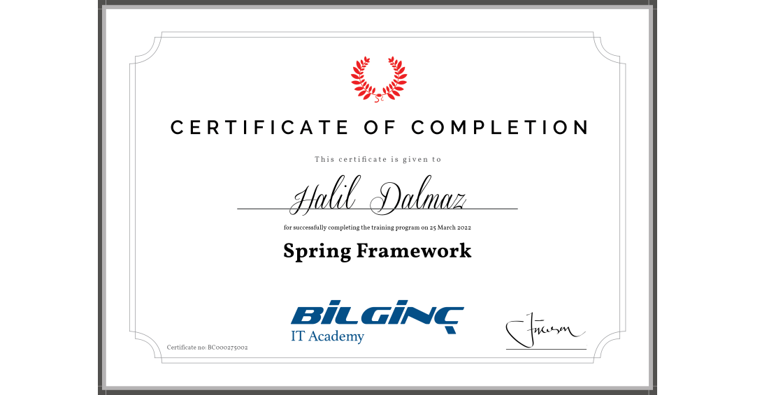 Spring Framework Training Completion Certificate