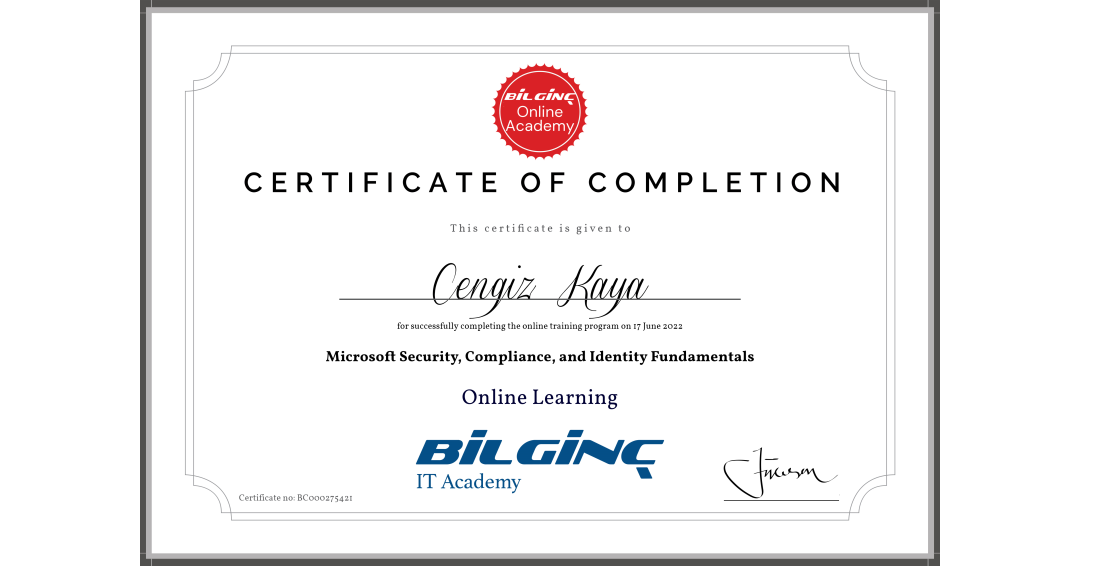Microsoft Security, Compliance, and Identity Fundamentals (SC-900) Training Completion Certificate
